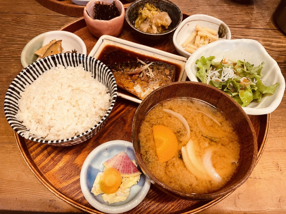내용물이 있는 미소시루 그리고 반찬이 몇 개 있어서